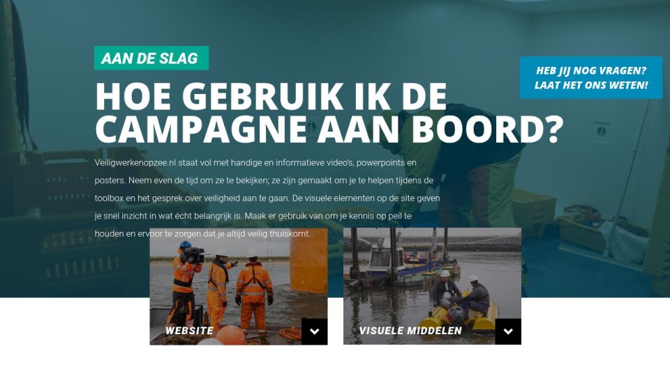 Veiligwerkenopzee.nl staat vol met handige en informatieve video's, powerpoints en posters. Neem even de tijd om ze te bekijken; ze zijn gemaakt om je te helpen tijdens de toolbox en het gesprek over veiligheid aan te gaan. De visuele elementen op de site geven je snel inzicht in wat écht belangrijk is. Maak er gebruik van om je kennis op peil te houden en ervoor te zorgen dat je altijd veilig thuiskomt.