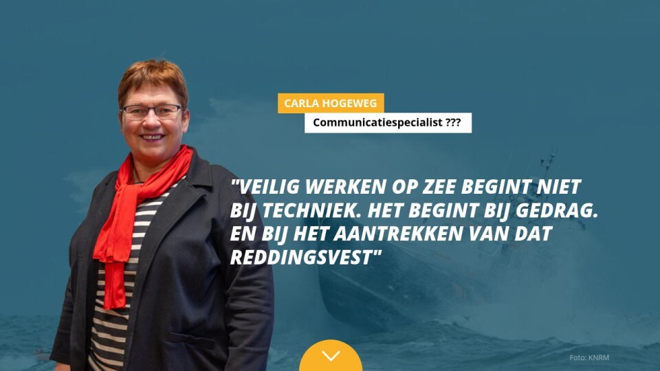 Mijn naam is Carla Hogeweg en ben sinds 1987 actief in maritieme communicatie- en veiligheidsapparatuur. Mijn man, met wie ik ons bedrijf run, is technisch onderlegd. Ik doe meer de commerciële kant van onze organisatie. Maar los van die rollen delen we één overtuiging: werken op zee kan alleen verantwoord worden als persoonlijke beschermingsmiddelen en reddingsmiddelen serieus worden genomen. Die overtuiging komt niet uit een handboek. Die komt echt uit ervaring.